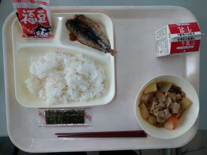 本日の給食のメニューは、いわしのしょうがじょうゆかけ、含め煮、いり大豆、焼きのり、ごはん、牛乳でした。