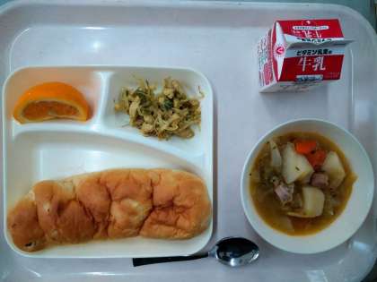 本日の給食のメニューは、ポトフ、カレーソテー、いよかん、おさつパン、牛乳でした。