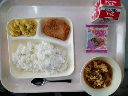 本日の給食のメニューは、カツ丼、キャベツの梅風味味、いもけんぴフィシュ、牛乳でした。