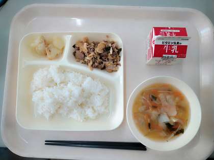 本日の給食のメニューは、豚肉と干しずいきのみそ汁、五目汁、焼きじゃが、ごはん、牛乳でした。