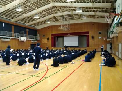 私立高校受験の準備と諸注意を行いました。入試当日の持ち物や服装、入試に向けての心構えを細かくお話ししました。不安や緊張があると思いますが、受験生みな同じです。「できる!」と自信を持って臨むことが大切であるとのお話でした。