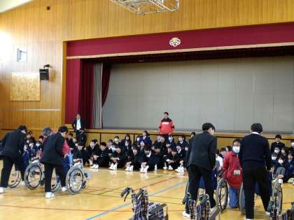 まずは、体育館で車いすの使用方法などの講話を聞きました。2限目は、グループ活動を通じての実演を行いました。とても丁寧に指導していただきました。ありがとうございました。