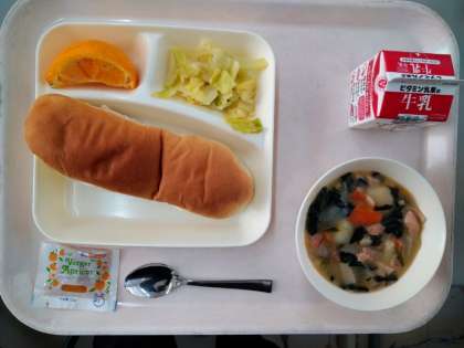 本日の給食は、鶏肉とほうれん草のシチュー、キャベツのサラダ、デコポン、コッペパン、アプリコットジャム、牛乳でした。