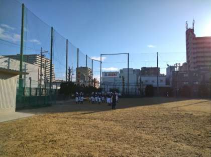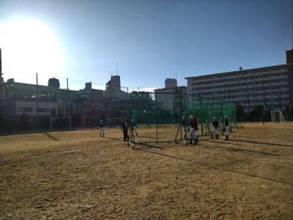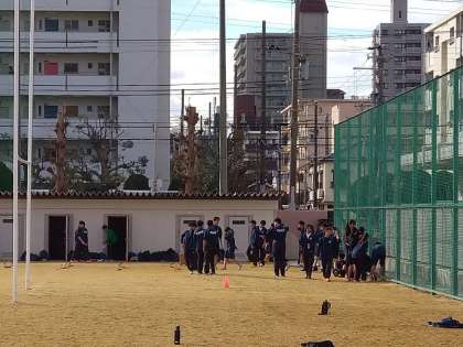 グラウンドではたくさんの部活動が練習に取り組んでいます。野球部は、防球ネットの準備、陸上部はアップをしていました。