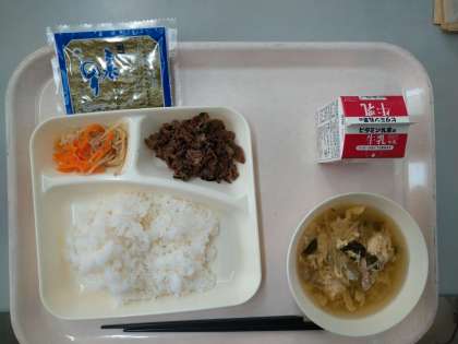 本日の給食は、キンパ、卵の中華スープ、牛乳でした。