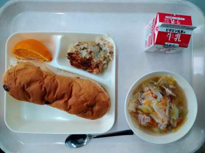 本日の給食は、押麦のグラタン、スープ、デコポン、レーズンパン、牛乳でした。