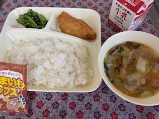 今日の給食は「たらフライ、うすくず汁、小松菜のごまあえ、おさつチップス、ごはん、牛乳」でした。皆さん、お味はいかがでしたか?