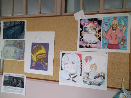 美術室の前の掲示板には、美術部のみなさんの素晴らしい作品が展示されています。ご鑑賞ください。