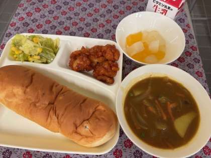 今日の給食は、あげどりのバーベキューソース、カレースープ、キャベツとコーンのサラダ、フルーツゼリー、おさつパン、牛乳でした。