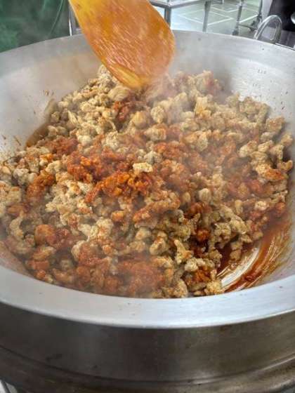 あげどりのバーベキューソースは、鶏肉ににんにくとワインで下味をつけた鶏肉にでんぷんをまぶして油で揚げ、砂糖、ケチャップ、トンカツソース、ウスターソース、少量の湯を加えて作ったソースをからめています。今日は普段より1品多く、ボリュームのある給食に仕上がっています。