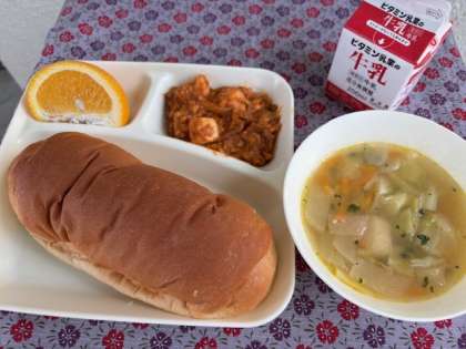 ☆給食室からこんにちは☆3月12日〜とうふのミートグラタン、じゃがいもと野菜のスープ、はっさく、黒糖パン、牛乳〜