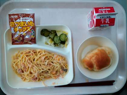 本日の給食は、さけのクリームスパゲッティ、キャベツときゅうりのサラダ、おさつチップス、ミニコッペパン、牛乳でした。
