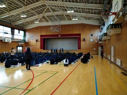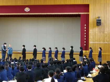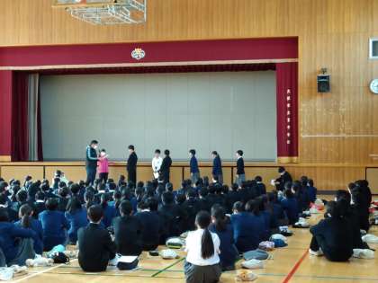 本日、1年生の学年集会が行なわれました。今年度最後の学年集会でした。一昨日の百人一首大会、昨日のドッジボール大会の表彰が行われました。