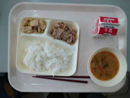 本日の給食は、豚肉のしょうが焼き、みそ汁、高野どうふの煮もの、ごはん、牛乳でした。