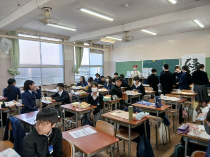 今年度の給食スタートの日です。給食調理員のみなさん、美味しい給食、いつもありがとうございます。給食時、放送部が素敵な音楽を流してくれています。いつもありがとうございます。放送で流す、リクエスト曲についてのお話がありました。
