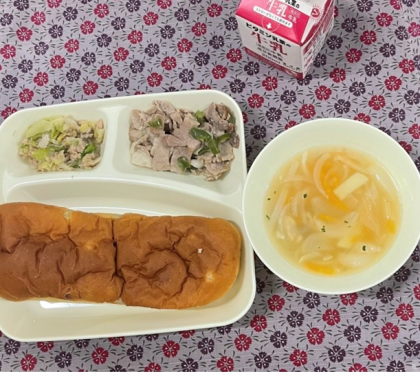 本日の給食は、やきとり、豚肉のガーリック焼き、スープ、ツナとキャベツのソテー、おさつパン、牛乳でした。