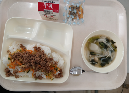 本日の給食は、ビビンバ、トック、いもけんぴフィッシュ、牛乳でした。