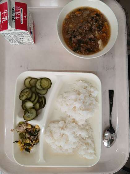 本日の給食は、マーボーどうふ、きゅうりの中華あえ、ツナとチンゲン菜のいためもの、ごはん、牛乳でした。