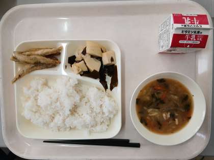 今日の給食は、きびなごのてんぷら、みそ汁、わかたけ煮、ごはん、牛乳でした。