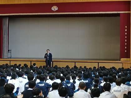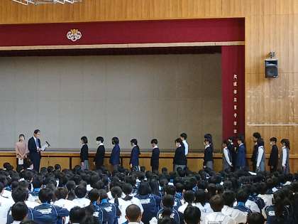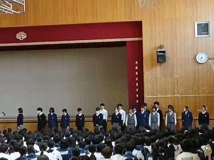 本日は、全校集会を体育館で行いました。グラウンドを予定していましたが、グラウンド状態が悪いため、体育館で認証式を行いました。