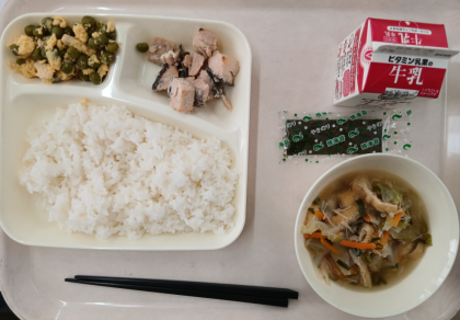今日の給食は、さけのみそ焼き、五目汁、えんどうの卵とじ、焼きのり、ごはん、牛乳でした。