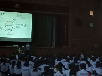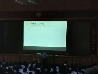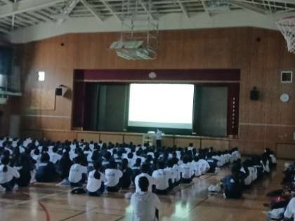 本日、6限目1年生は性教育に取り組みました。体育館で、保健室の先生より説明がありました。パワーポイントを使用し、性教育について学びました。内容は、LGBTQについての話や人との距離感・境界線について知り、人との関わり方について学びました。