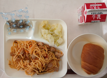 本日の給食は、チキントマトスパゲッティ、キャベツのピクルス、ミニフィッシュ、ミニコッペパン、牛乳でした。