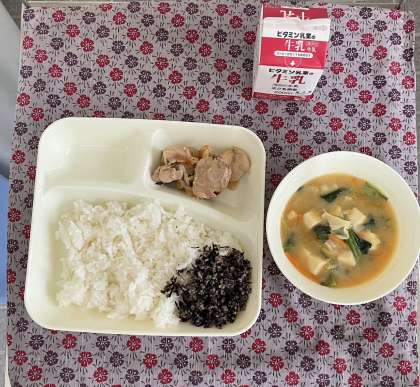 本日の給食は、鶏肉の甘辛焼き、みそ汁、魚ひじきそぼろ、ごはん、牛乳でした。