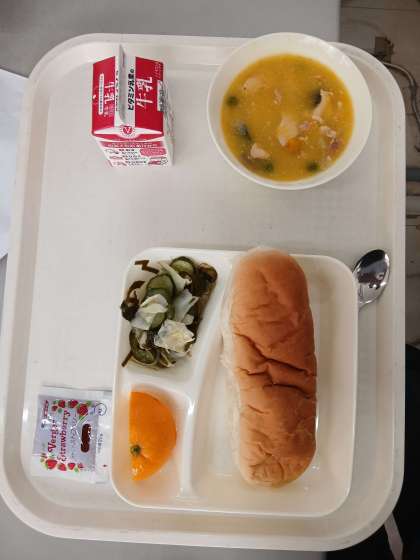 本日の給食は、鶏肉とかぼちゃのシチュー、ミックス海藻のサラダ、オレンジ、コッペパン、いちごジャム、牛乳でした。
