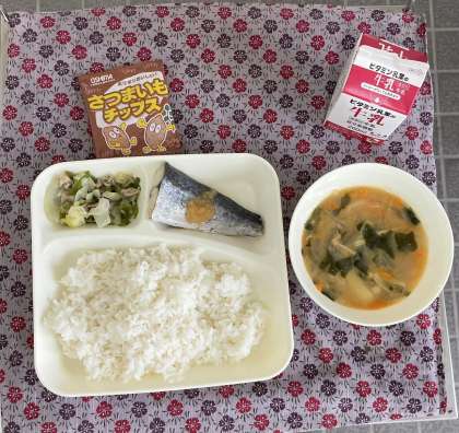 本日の給食は、さごしのおろしじょうゆかけ、みそ汁、野菜いため、おさつチップス、ごはん、牛乳でした。