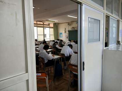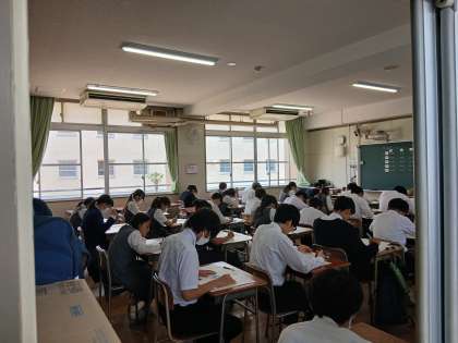 本日、第1回実力テストが行われます。1時間目の英語の様子です。リスニングを終え、筆記テストに取り組んでいます。今日は5教科のテストを受けます。最後まで、しっかりと頑張ってください!