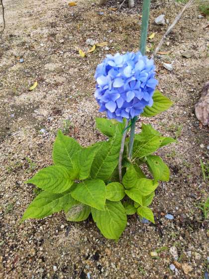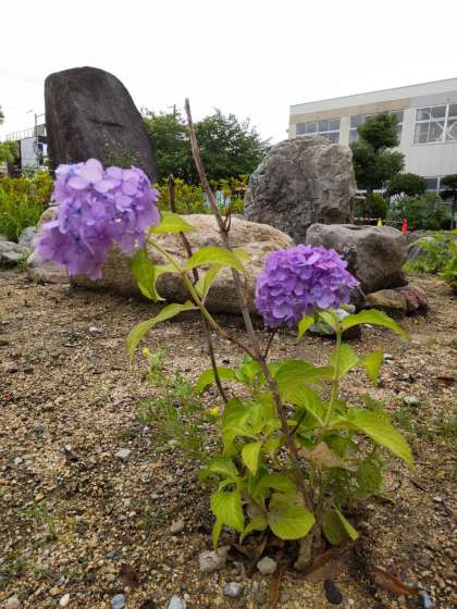 中庭にあじさいが咲いていました。きれいなお花が咲いています。とても鮮やかなすみれ色です。