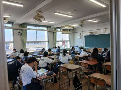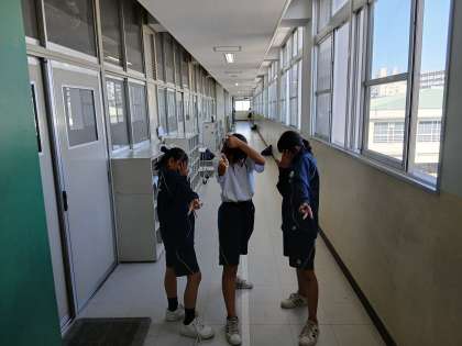 放課後、1年生は教育相談が行われていました。廊下で待っている生徒のみなさんが、ポーズを取ってくれました。
