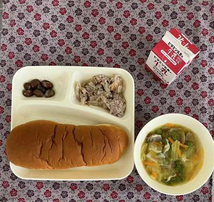 本日の給食は、鶏肉のバジル焼き、鶏肉とキャベツのスープ、うずら豆のグラッセ、黒糖パン、牛乳でした。