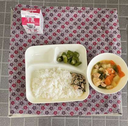 本日の給食は、鶏肉と一口がんもの煮もの、オクラの梅風味、ツナっ葉いため、ごはん、牛乳でした。