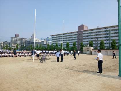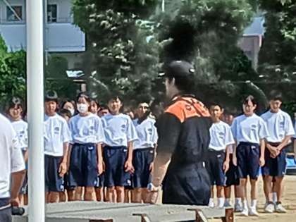 5分ほどで避難できました。消防署の方もスムーズに避難できていましたと仰っていました。備えは必要ですが、このような形で、避難することがない学校生活を送りたいものです。暑い中での避難訓練でしたので、短時間で終了しました。菫中学校のみなさんが、きちんとした行動ができましたので、早く終えました。