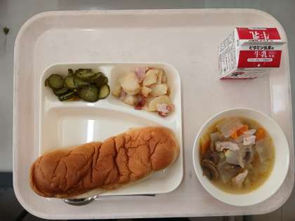本日の給食は、鶏肉と野菜のスープ煮、ジャーマンポテト、きゅうりとコーンのサラダ、おさつパン、牛乳でした。