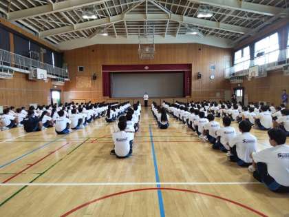 本日は、3年生の定例の学年集会の日でした。今日は、英語の家庭学習についての話でした。(最初に家庭学習のページ数のランキング発表がありました。)