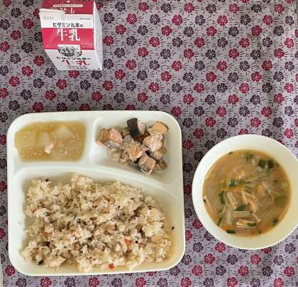 本日の給食は、さけのつけ焼き、みそ汁、とうがんの煮もの、かやくご飯、牛乳でした。