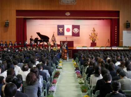 吹奏楽部の演奏で入退場、在校生が大きな声で校歌やマイバラードを歌い、新入生を歓迎しました。