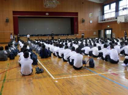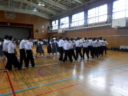 3年生は明日から修学旅行。最終の確認を全体で行いました。体育館に荷物を持って集合。行程の最終確認、荷物確認、係別、班別の集合などを行い、最後はフォークダンスの練習まで行いました。