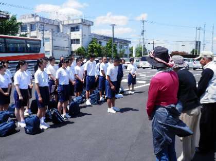 修学旅行2日目の朝、生徒は各農家で朝の活動をし、各地区で離村式を行いました。