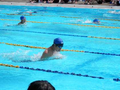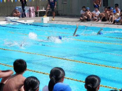 一かき一けりでしっかり伸びています 横一線の勝負です!