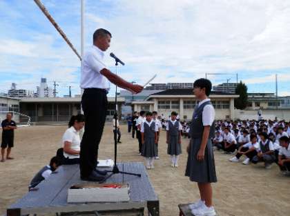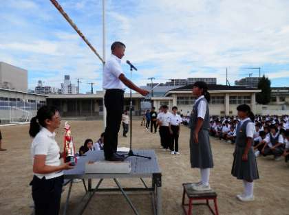 先週は、雨の関係で全校集会ができませんでした。今日は、台風の影響も心配されましたが、薄陽が射す中、集会を実施することができました。始業式の時に、渡しきれなかった部活動の表彰伝達を行いました。たくさんの伝達があったため、少し集会が延びてしまいました。