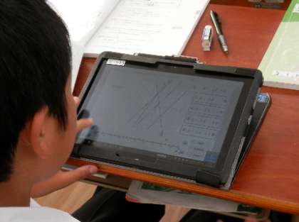 ICTを活用した授業が進んでいます。1年生の英語では、デジタル教科書の単語フラッシュカードを活用。発音と同時に単語と意味を交互に確認しながら、反復練習をしてます。2年生の数学では、一次関数のグラフを作成。各自タブレットを使って、自分のグラフが正しく書けているかどうかを調べます。