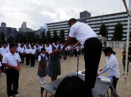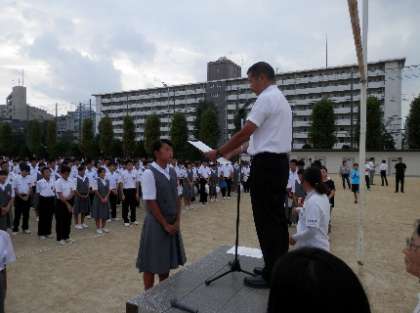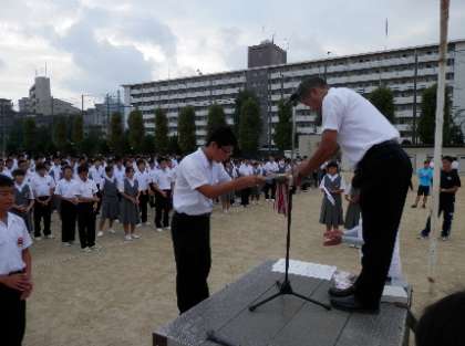 全校集会を行いました。昨日行われた部活動の大会でいただいた賞状と盾、トロフィーを伝達しました。
