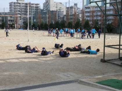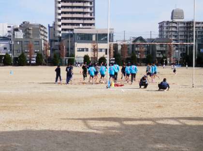 本日も早朝からグランドでは大きな声が飛び交っていました。ラグビー部が他校と試合を、ソフトテニス部が中庭で練習に取り組み、体育館では、男子バスケットボール部が明日の大会に向けて練習に励んでいました。校舎内では吹奏楽部が練習していました。午後からは、野球部と陸上部の練習が行われ、バレーボール部が練習試合に取り組んでいました。陸上部は、府下の中学校と合同練習を行っていました。種目別のグループに別れて練習していました。普段とは違うメンバーと練習をすることで、お互いの意識を高めることができるようでした。