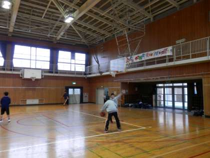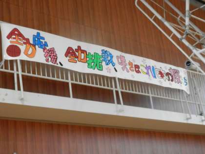 本日午後、四カ国国際女子車いすバスケットボール大阪大会に出場する日本女子チームが来校される予定です。明日からの大会に向けて、本日はデモンストレーションというかたちで車椅子バスケットボールについて教えていただく予定です。横断幕を掲げて来校をお待ちしています。バスケットボール部の朝練習の様子です。↑