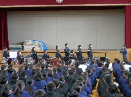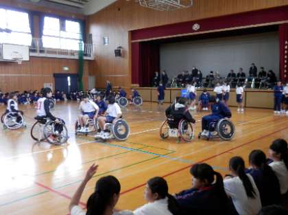 本日午後、女子車椅子バスケットボールの日本代表チームが来校されました。本校の1.2年生を対象に、車椅子バスケットボールのルールや車椅子の操作の仕方、普通の車椅子と競技用との違いなどを含め、競技の魅力について説明していただき、体験させていただきました。
