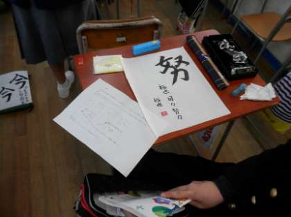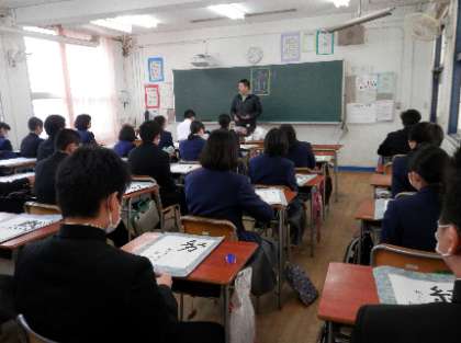 3年生では、中学校最後の授業に取り組む教科も出てきています。今週に入って、3年間継続してきた書写の授業も終わりを迎えています。最後の授業では、太筆の一文字書きに挑戦、自分の思いを一文字で表現し、その横にその文字に込められた想いを細筆で書き添えました。素晴らしい作品ができました。ぜひ自宅で目にとまるところに掲げてほしいものです。写真は、1日(木)の授業の様子です。
